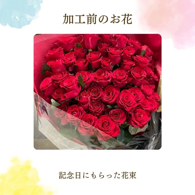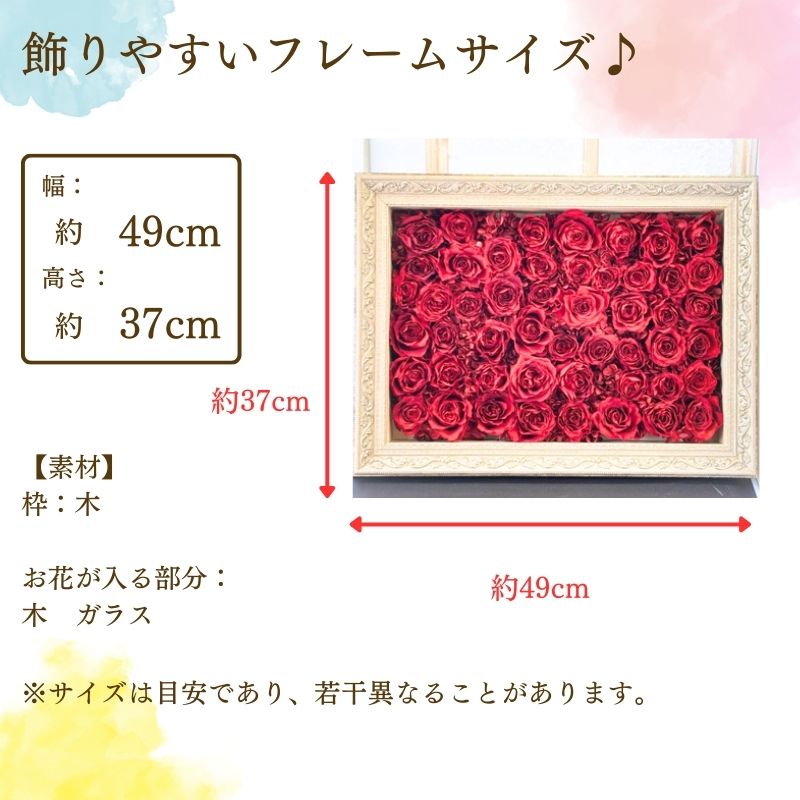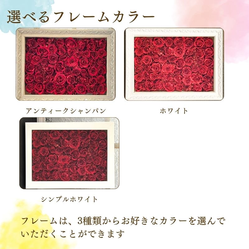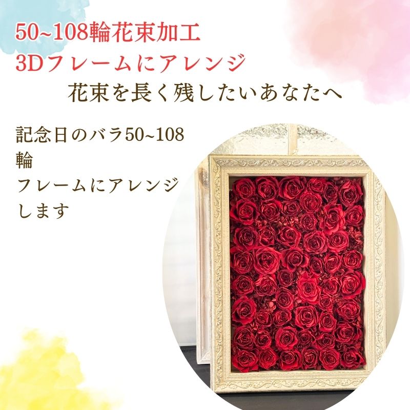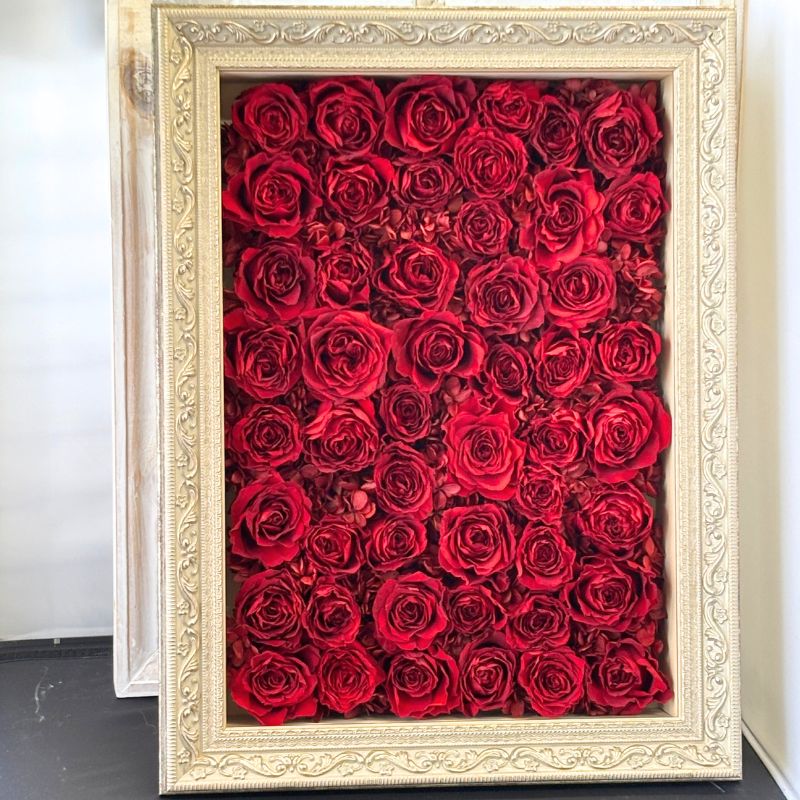 29~108輪のバラをプリザーブドフラワーに加工しフレームにアレンジ致します。