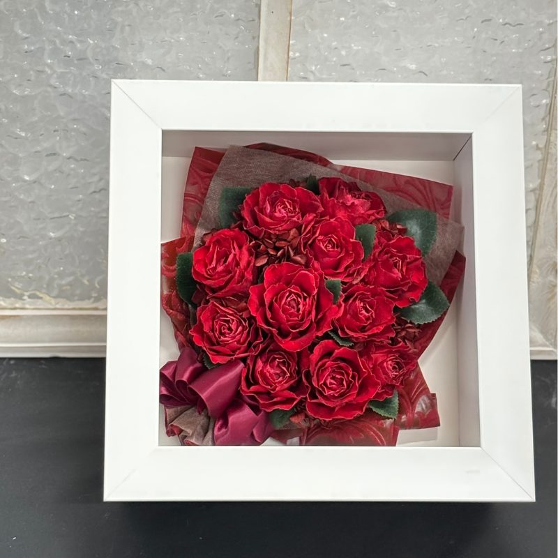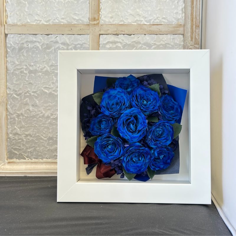 10~15輪のバラとカスミソウをプリザーブドフラワーに加工しフレームにアレンジ致します。
