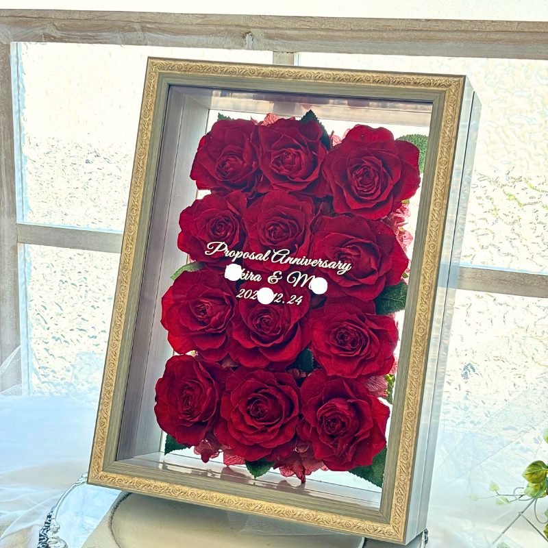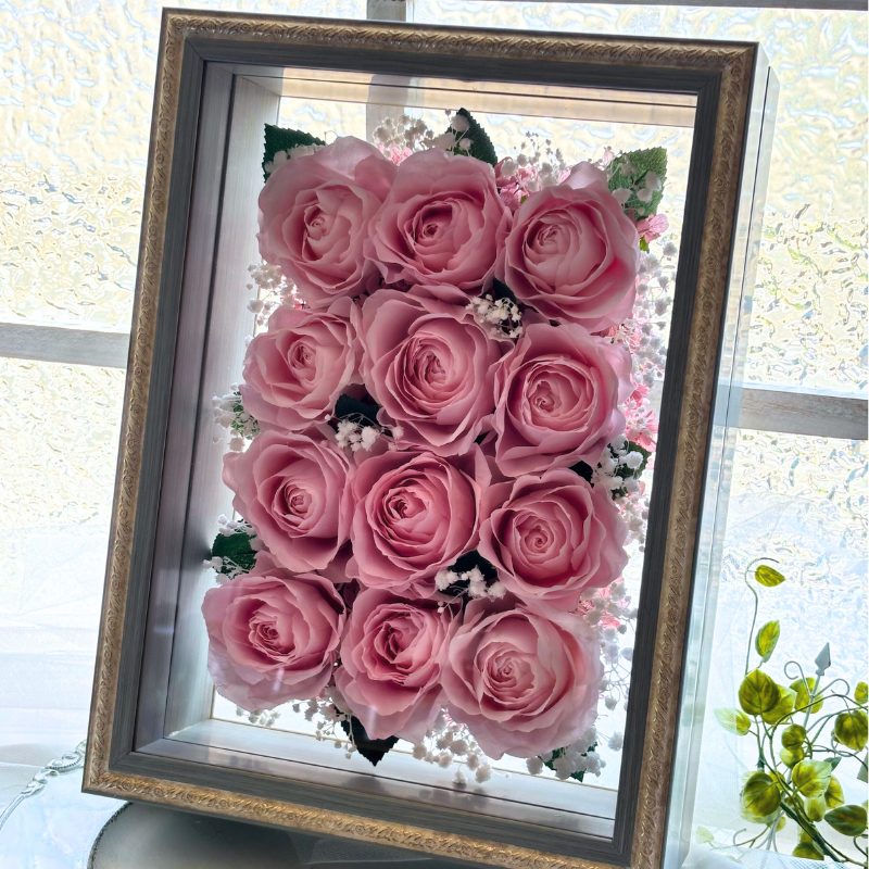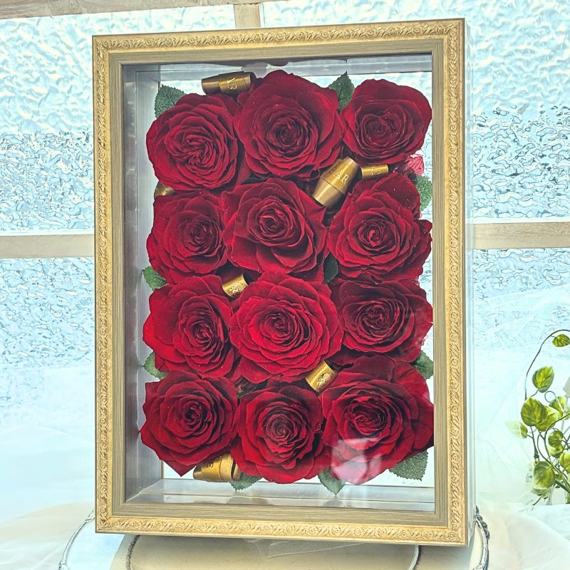 12輪のバラをプリザーブドフラワーに加工しフレームにアレンジ致します。