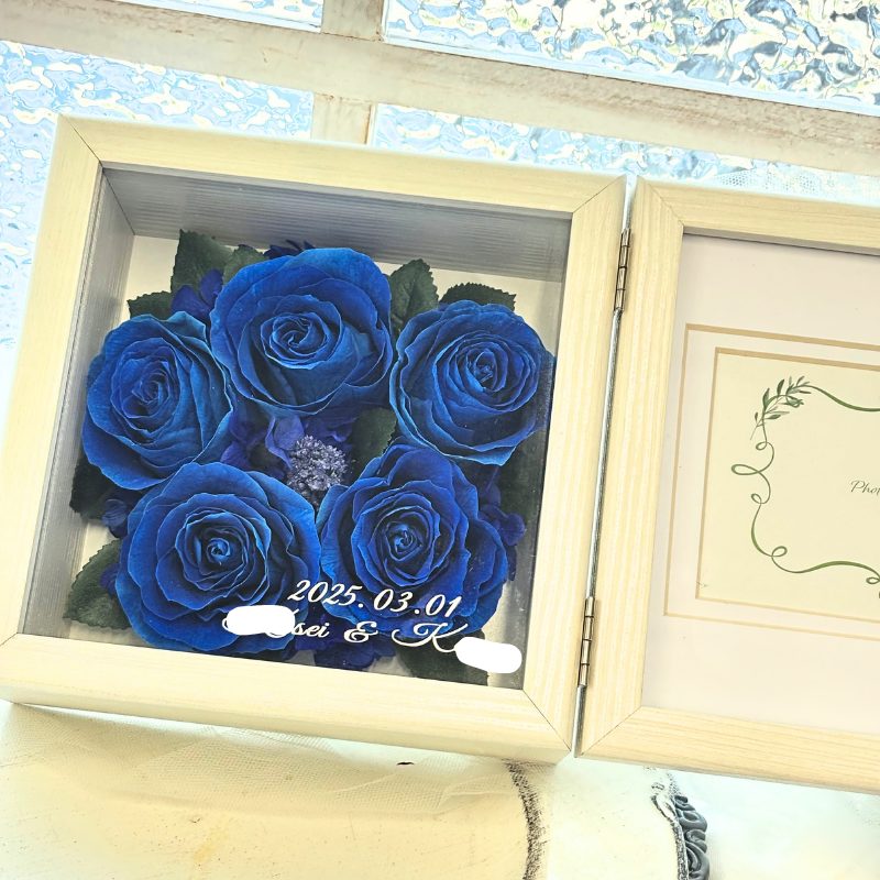 4~5輪のバラをプリザーブドフラワーに加工しフォトフレームアレンジ致します。