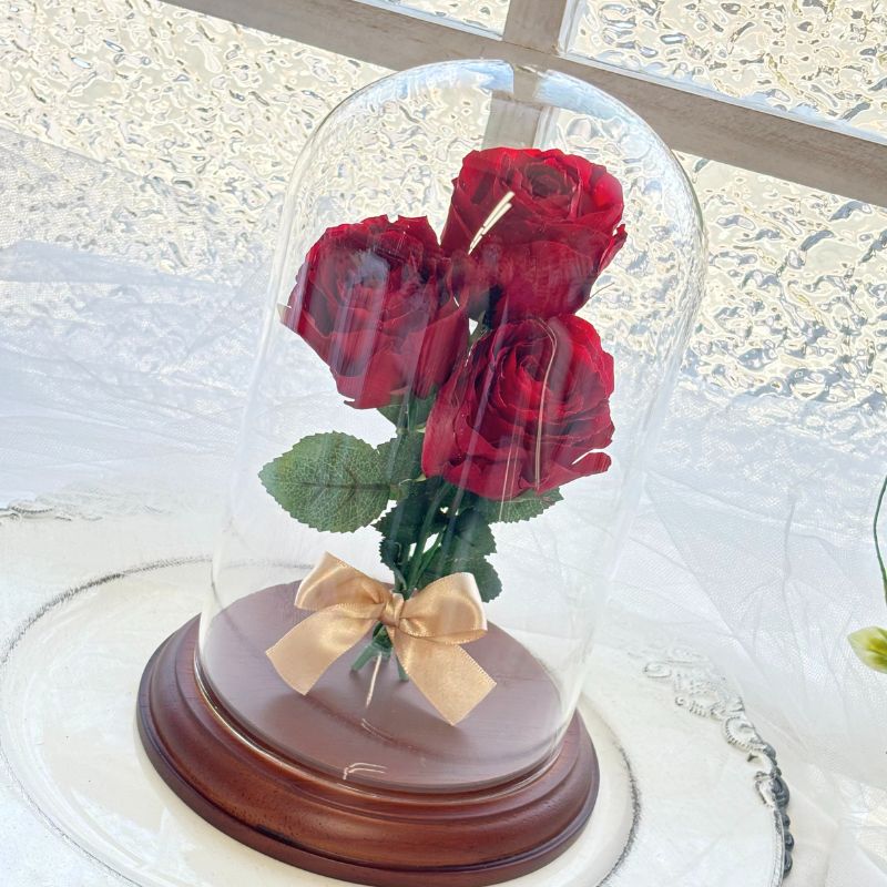 1~2輪のバラをプリザーブドフラワーに加工しガラスドームムアレンジ致します。